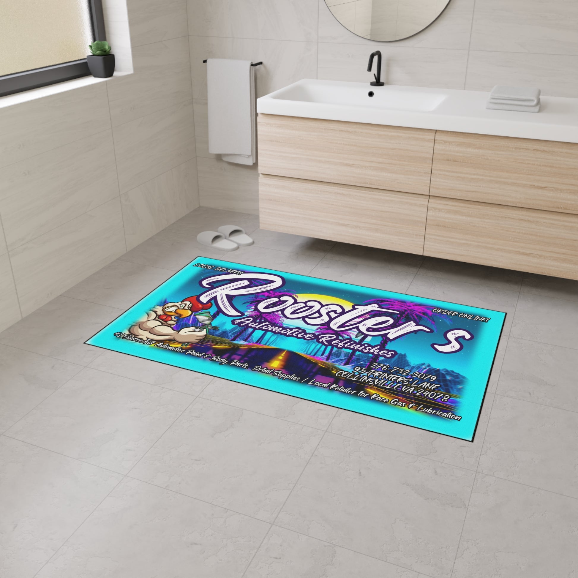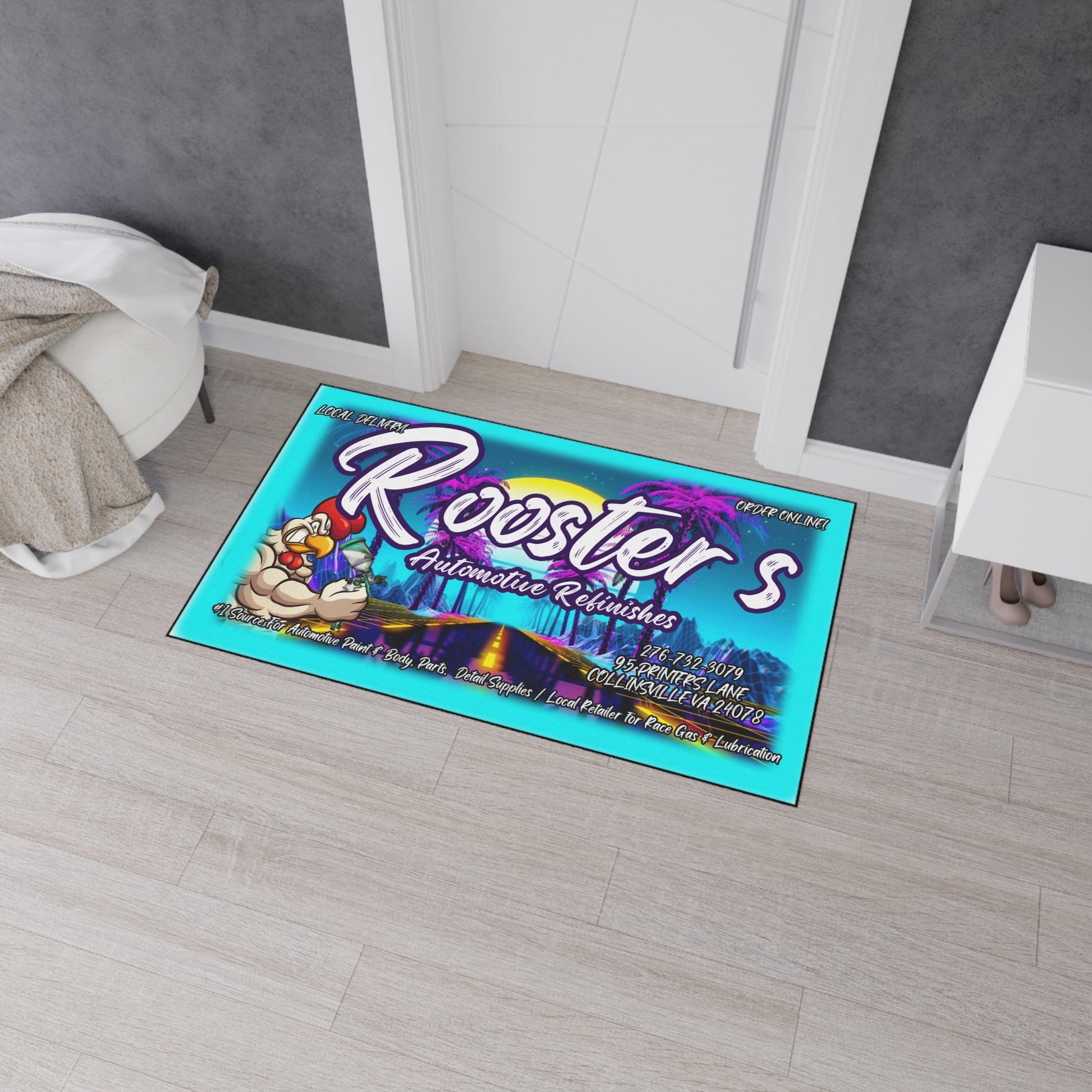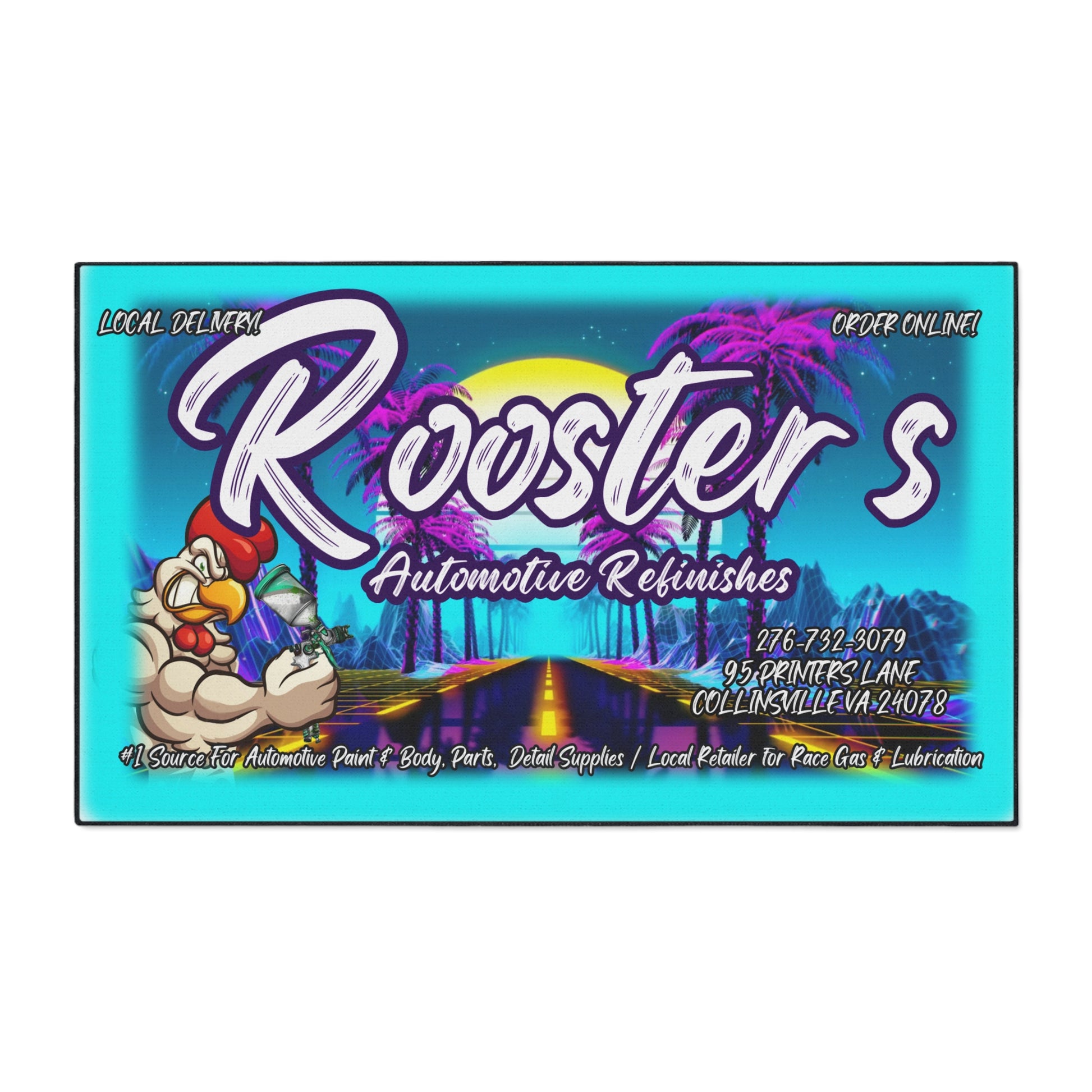Bring the bold energy of Rooster’s into your home or shop with this custom logo rug that’s built to last and designed to turn heads. Whether you're decking out the garage, shop floor, office, or your favorite room, this heavy-duty floor mat adds serious personality and grip where it counts.